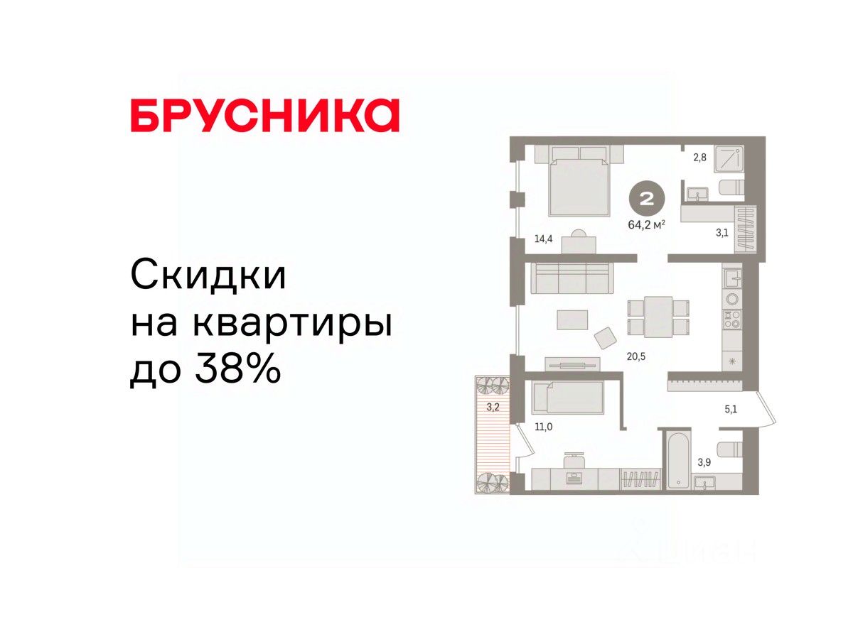 Просторная 2-комн. квартира с предчистовой отделкой в ЖК "Новин" на 6 этаже. Общая площадь: 64.15 кв.м., жилая: 25.4 кв.м., площадь просторной кухни-гостиной: 20.5 кв.м. Комнаты изолированные, все окна выходят на одну сторону. В квартире один балкон, два совмещенных санузла. Высота потолков 2.7 м.