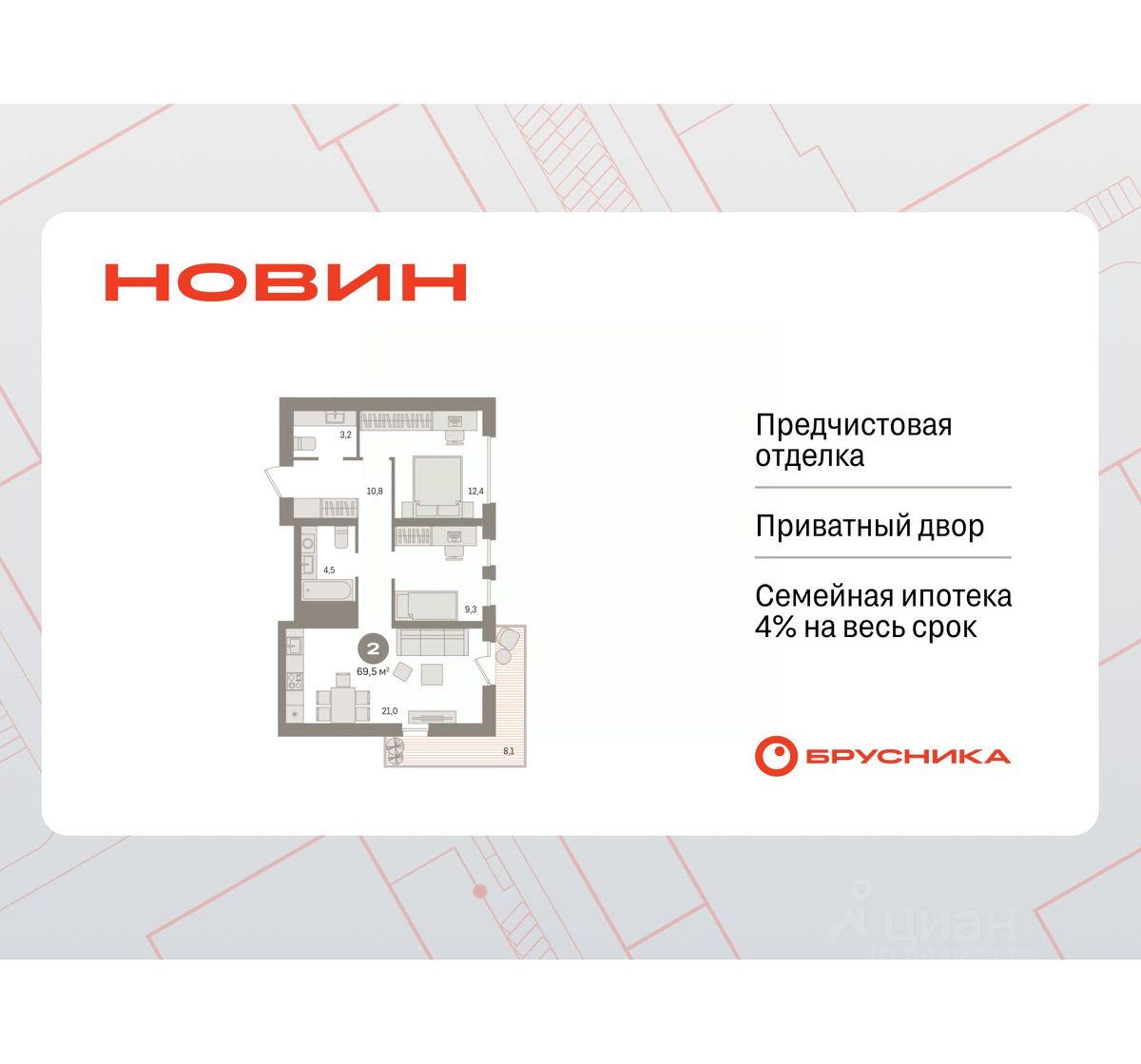 Двухкомнатная квартира с предчистовой отделкой в ЖК "Новин" на 4 этаже. Общая площадь: 69.48 кв.м., жилая: 21.7 кв.м., площадь просторной кухни-гостиной: 21 кв.м. Угловая квартира, окна oбecпeчивaют paвнoмepнoe ocвeщeниe в тeчeниe дня. В квартире один балкон, один совмещенный и один раздельный санузел. Высота потолков 2.7 м.