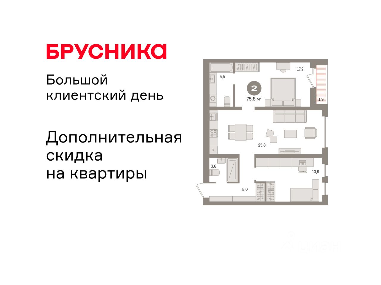 Квартира с кухней-гостиной и двумя спальнями в квартале "Новин". Особенности планировки: гардеробная, лоджия, мастер-спальня, предчистовая отделка, разнесённые спальни.