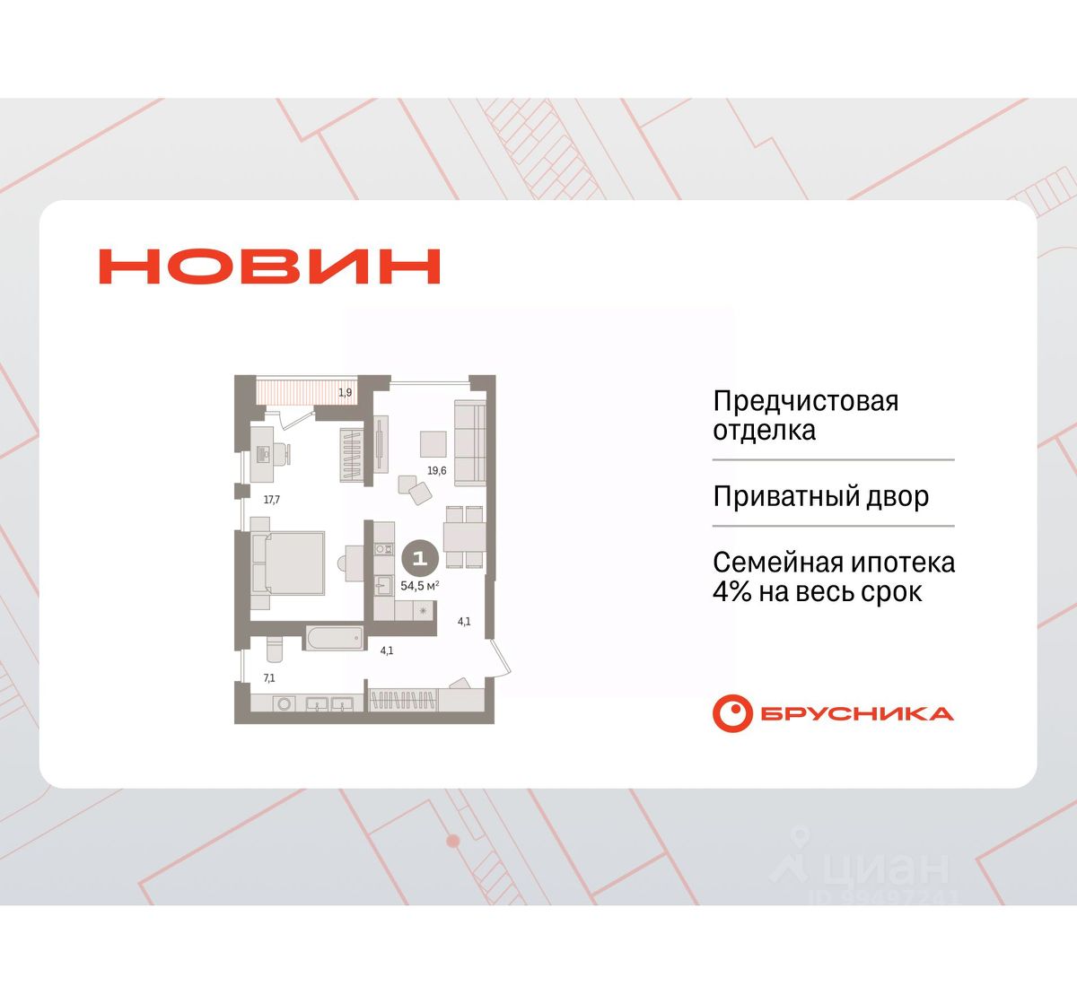 Продается 1-комн. квартира с предчистовой отделкой в ЖК "Новин" на 12 этаже. Общая площадь: 54.54 кв.м., жилая: 17.7 кв.м., площадь просторной кухни-гостиной: 19.6 кв.м. Квартира угловая, идеально подойдет любителям тишины и панорамных видов. В квартире одна лоджия, один совмещенный санузел. Высота потолков 2.7 м.