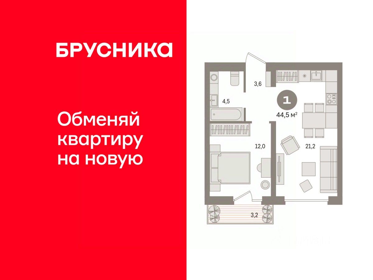 Квартира с кухней-гостиной и одной спальней в квартале "Новин". Особенности планировки: балкон, вид во двор, предчистовая отделка.