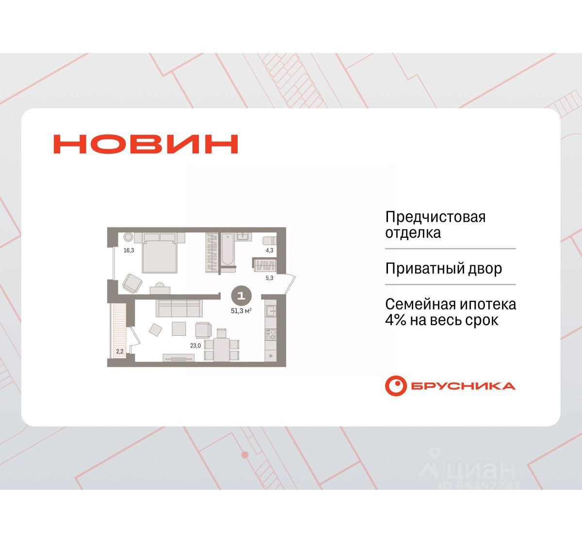 1-комн. квартира с предчистовой отделкой в ЖК "Новин" на 5 этаже. Общая площадь: 51.26 кв.м., жилая: 16.3 кв.м., площадь просторной кухни-гостиной: 23 кв.м. Все окна выходят на одну сторону. В квартире одна лоджия, один совмещенный санузел. Высота потолков 2.7 м.