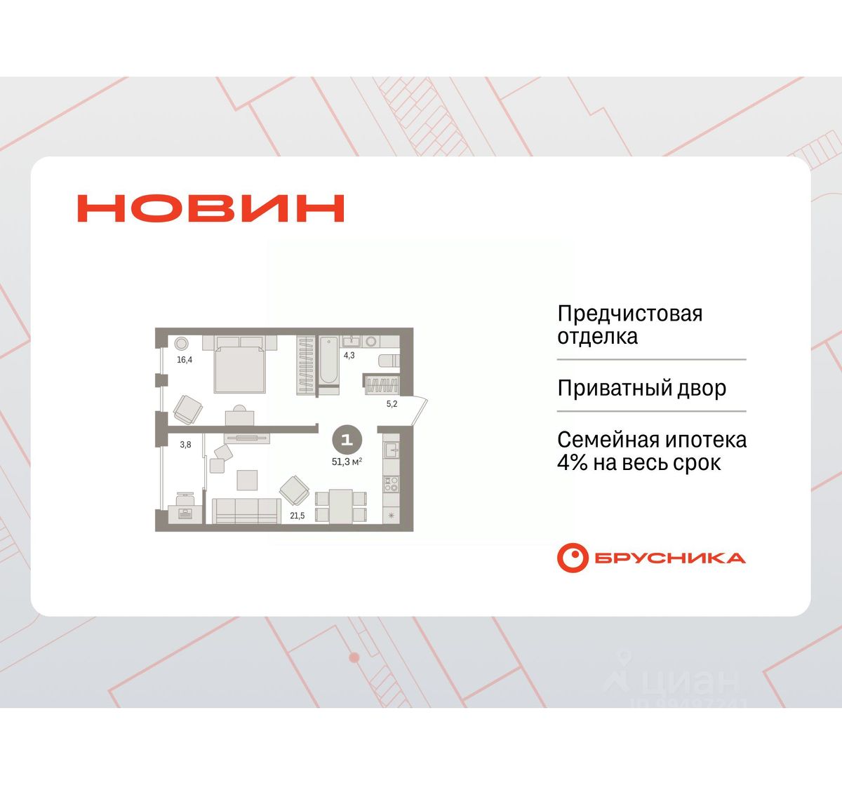 1-комн. квартира от застройщика с предчистовой отделкой в ЖК "Новин" на 5 этаже. Общая площадь: 51.28 кв.м., жилая: 16.4 кв.м., площадь просторной кухни-гостиной: 21.5 кв.м. Все окна выходят на одну сторону. В квартире одна лоджия, один совмещенный санузел. Высота потолков 2.7 м.