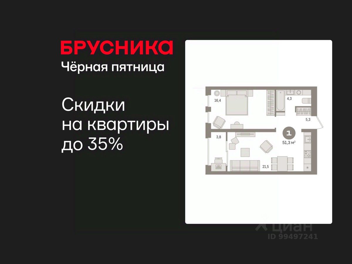 Квартира с кухней-гостиной и одной спальней в квартале "Новин". Особенности планировки: тёплая лоджия, предчистовая отделка.