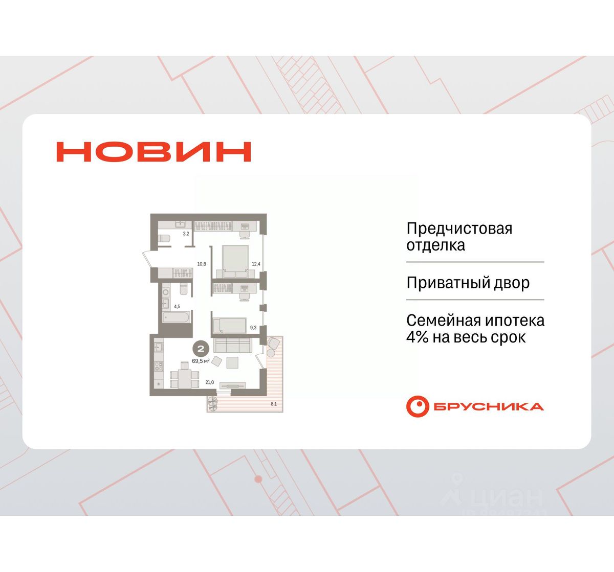 2-комн. квартира от застройщика с предчистовой отделкой в ЖК "Новин" на 11 этаже. Общая площадь: 69.49 кв.м., жилая: 21.7 кв.м., площадь просторной кухни-гостиной: 21 кв.м. Квартира угловая, очень светлая, естественная вентиляция при открытии окон. В квартире один балкон, один совмещенный и один раздельный санузел. Наличие террасы в квартире открывает возможность для обустройства дополнительной площади. Высота потолков 2.7 м.