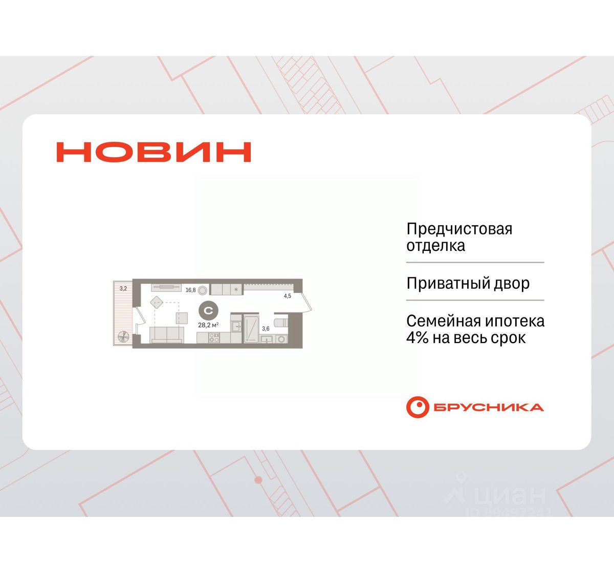 Однокомнатная студия с предчистовой отделкой в ЖК "Новин" на 5 этаже. Общая площадь: 28.18 кв.м., площадь гостиной 16.9 кв.м., из которых 5 кв.м. выделено под кухонную зону. Все окна выходят на одну сторону. В квартире один балкон, один совмещенный санузел. Высота потолков 2.7 м.