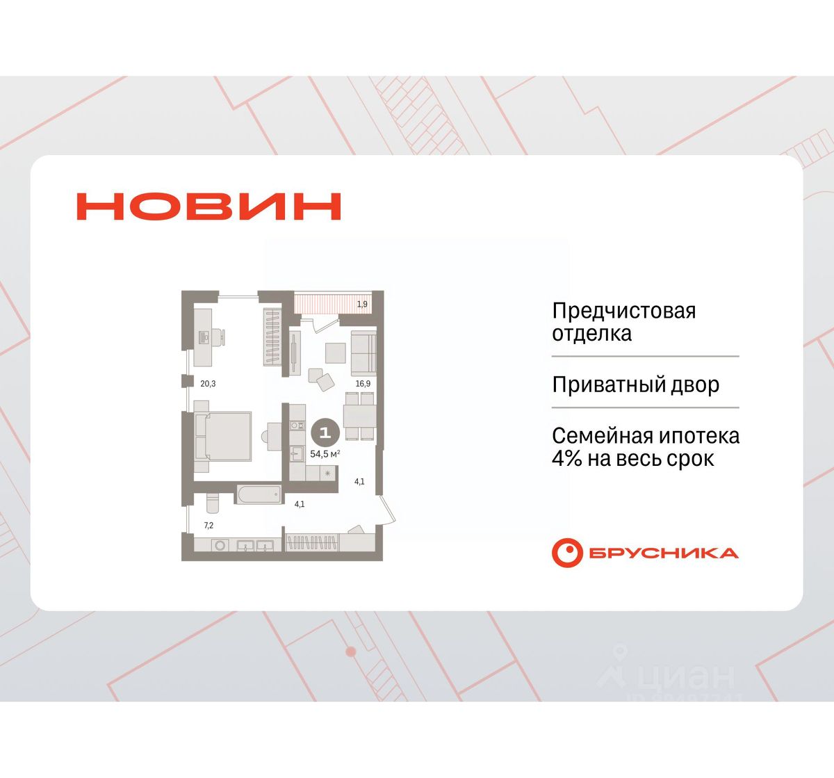 Продается 1-комн. квартира с предчистовой отделкой в ЖК "Новин" на 15 этаже. Общая площадь: 54.45 кв.м., жилая: 20.3 кв.м., площадь просторной кухни-гостиной: 16.9 кв.м. Квартира угловая, очень светлая, естественная вентиляция при открытии окон. В квартире одна лоджия, один совмещенный санузел. Высота потолков 2.7 м.