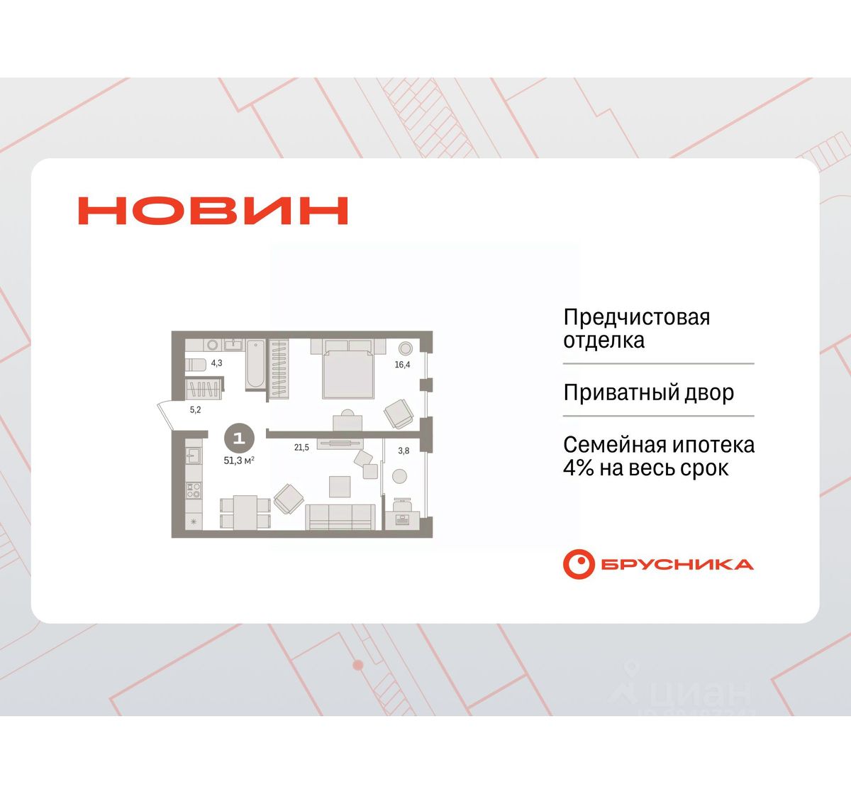 Однокомнатная квартира от застройщика с предчистовой отделкой в ЖК "Новин" на 13 этаже. Общая площадь: 51.28 кв.м., жилая: 16.4 кв.м., площадь просторной кухни-гостиной: 21.5 кв.м. Все окна выходят на одну сторону. В квартире одна лоджия, один совмещенный санузел. Высота потолков 2.7 м.