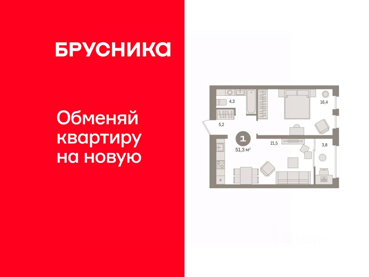 Квартира с кухней-гостиной и одной спальней в квартале "Новин". Особенности планировки: предчистовая отделка, тёплая лоджия.