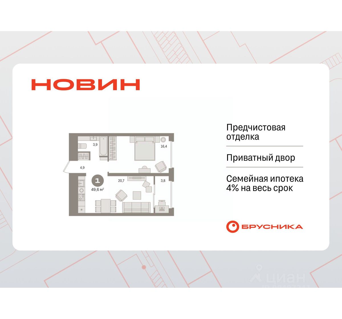 Квартира с кухней-гостиной и одной спальней в квартале "Новин". Особенности планировки: тёплая лоджия, предчистовая отделка.