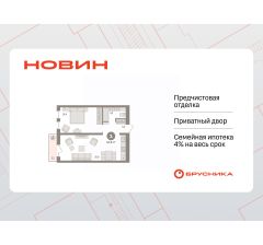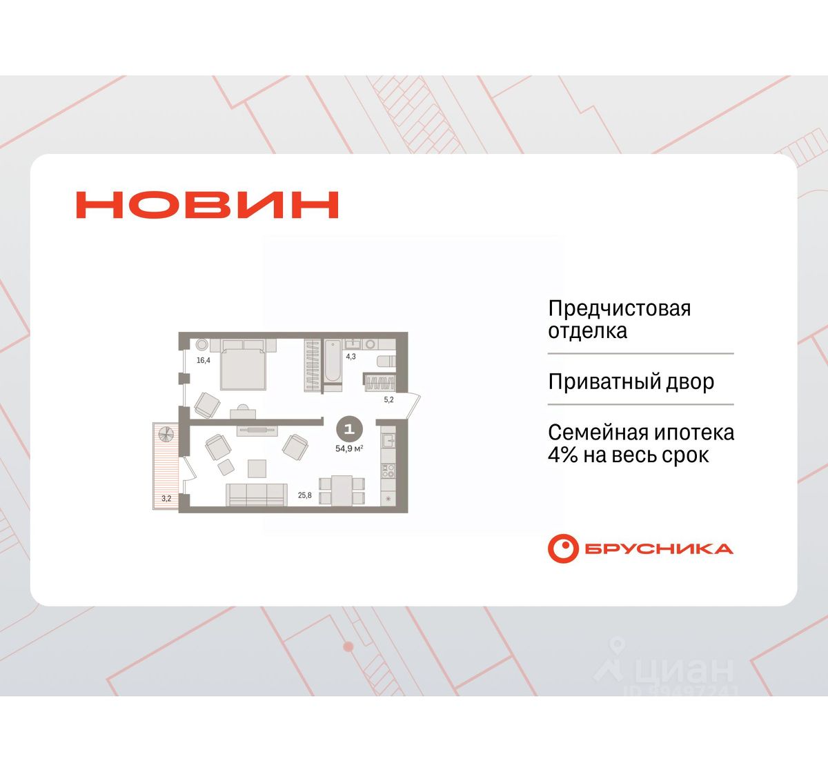 1-комн. квартира с предчистовой отделкой в ЖК "Новин" на 4 этаже. Общая площадь: 54.92 кв.м., жилая: 16.4 кв.м., площадь просторной кухни-гостиной: 25.8 кв.м. Все окна выходят на одну сторону. В квартире один балкон, один совмещенный санузел. Высота потолков 2.7 м.