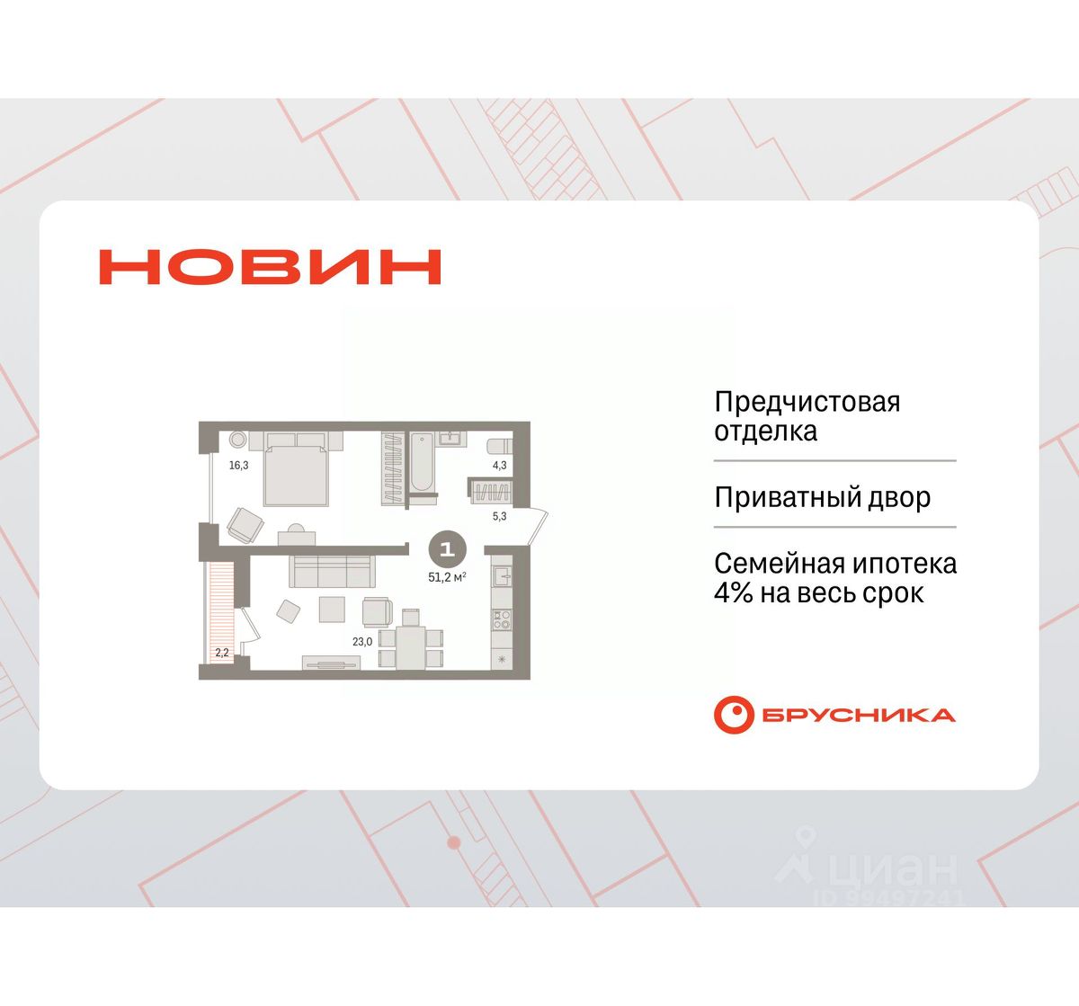 1-комн. квартира с предчистовой отделкой в ЖК "Новин" на 9 этаже. Общая площадь: 51.24 кв.м., жилая: 16.3 кв.м., площадь просторной кухни-гостиной: 23 кв.м. Все окна выходят на одну сторону. В квартире одна лоджия, один совмещенный санузел. Высота потолков 2.7 м.
