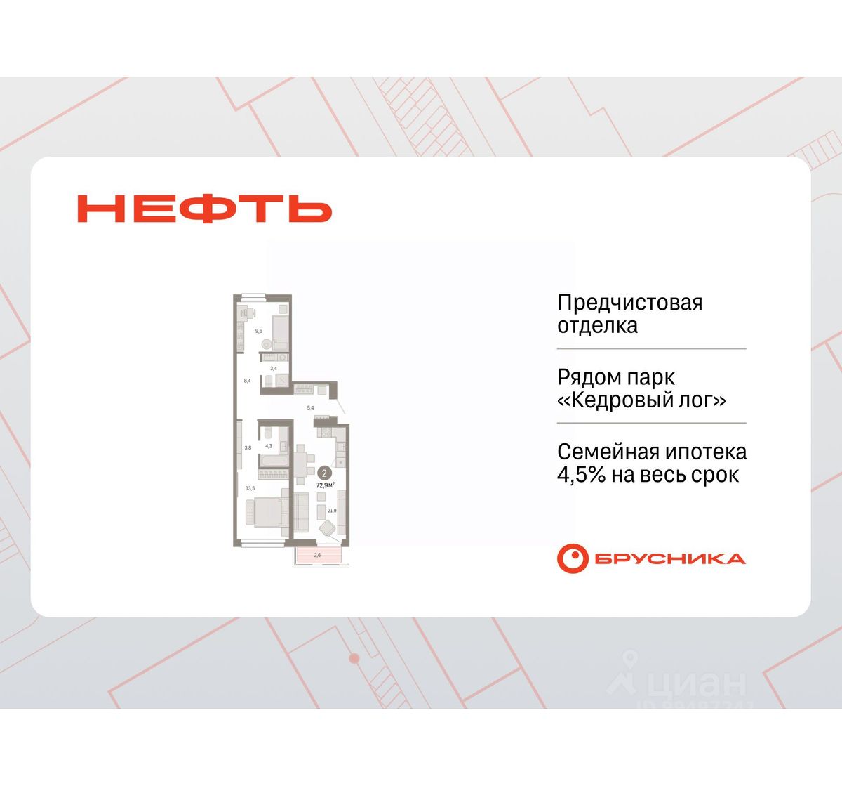 Квартира с кухней-гостиной и двумя спальнями в квартале "Нефть". Особенности планировки: вид во двор, разнесённые спальни, предчистовая отделка, мастер-спальня, балкон.