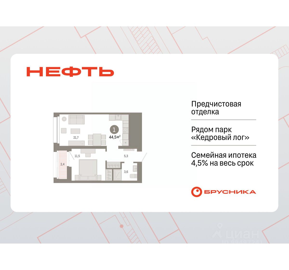 1-комн. квартира с предчистовой отделкой в ЖК "Нефть" на 5 этаже. Общая площадь: 44.5 кв.м., жилая: 11.5 кв.м., площадь просторной кухни-гостиной: 21.7 кв.м. Все окна выходят на одну сторону. В квартире одна лоджия, один совмещенный санузел. Высота потолков 2.7 м.