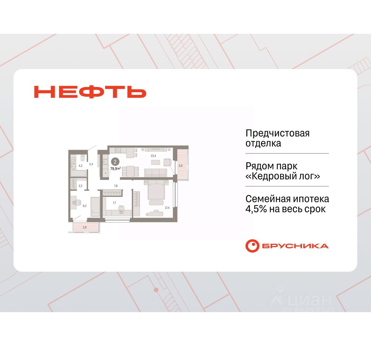 Двухкомнатная квартира с предчистовой отделкой в ЖК "Нефть" на 7 этаже. Общая площадь: 79.9 кв.м., жилая: 26.6 кв.м., площадь просторной кухни-гостиной: 23.4 кв.м. Квартира угловая, очень светлая, естественная вентиляция при открытии окон. В квартире два балкона, один совмещенный санузел. Высота потолков 2.7 м.