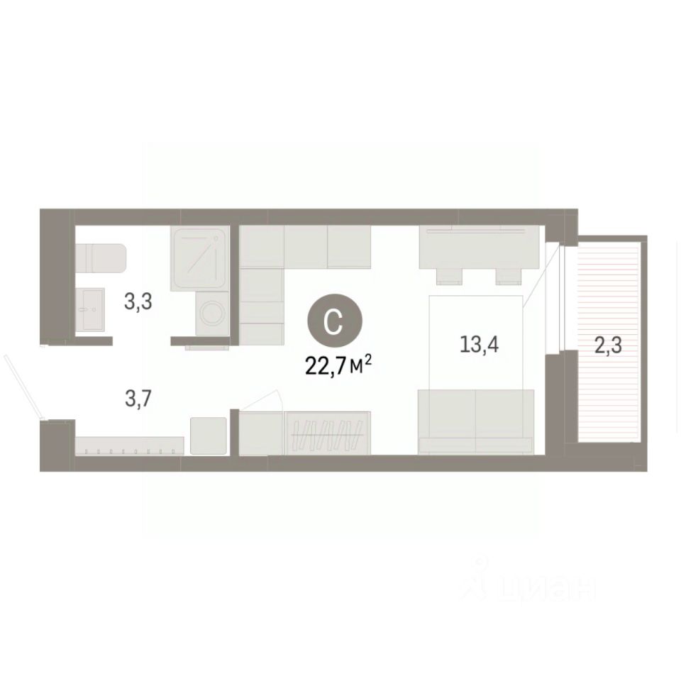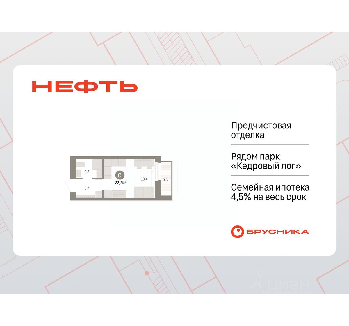 Однокомнатная студия с предчистовой отделкой в ЖК "Нефть" на 7 этаже. Общая площадь: 22.7 кв.м., площадь гостиной 13.4 кв.м., из которых 5 кв.м. выделено под кухонную зону. Все окна выходят на одну сторону. В квартире один балкон, один совмещенный санузел. Высота потолков 2.7 м.
