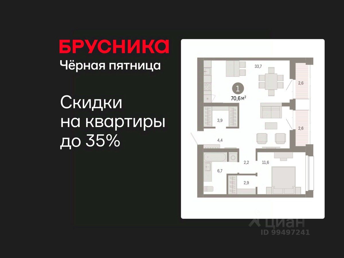 Квартира с кухней-гостиной и одной спальней в квартале "Нефть". Особенности планировки: гардеробная, окна в пол, лоджия, предчистовая отделка.