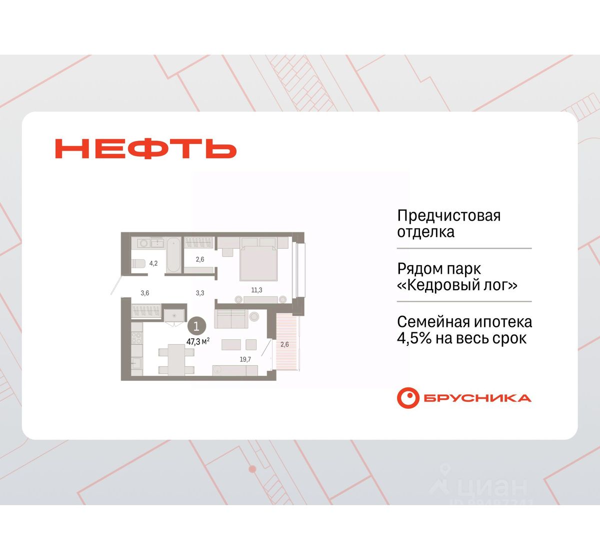 Квартира с кухней-гостиной и одной спальней в квартале "Нефть". Особенности планировки: гардеробная, лоджия, предчистовая отделка.