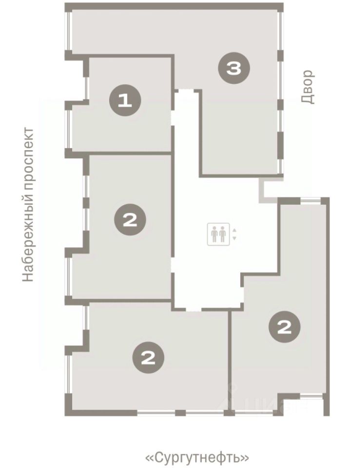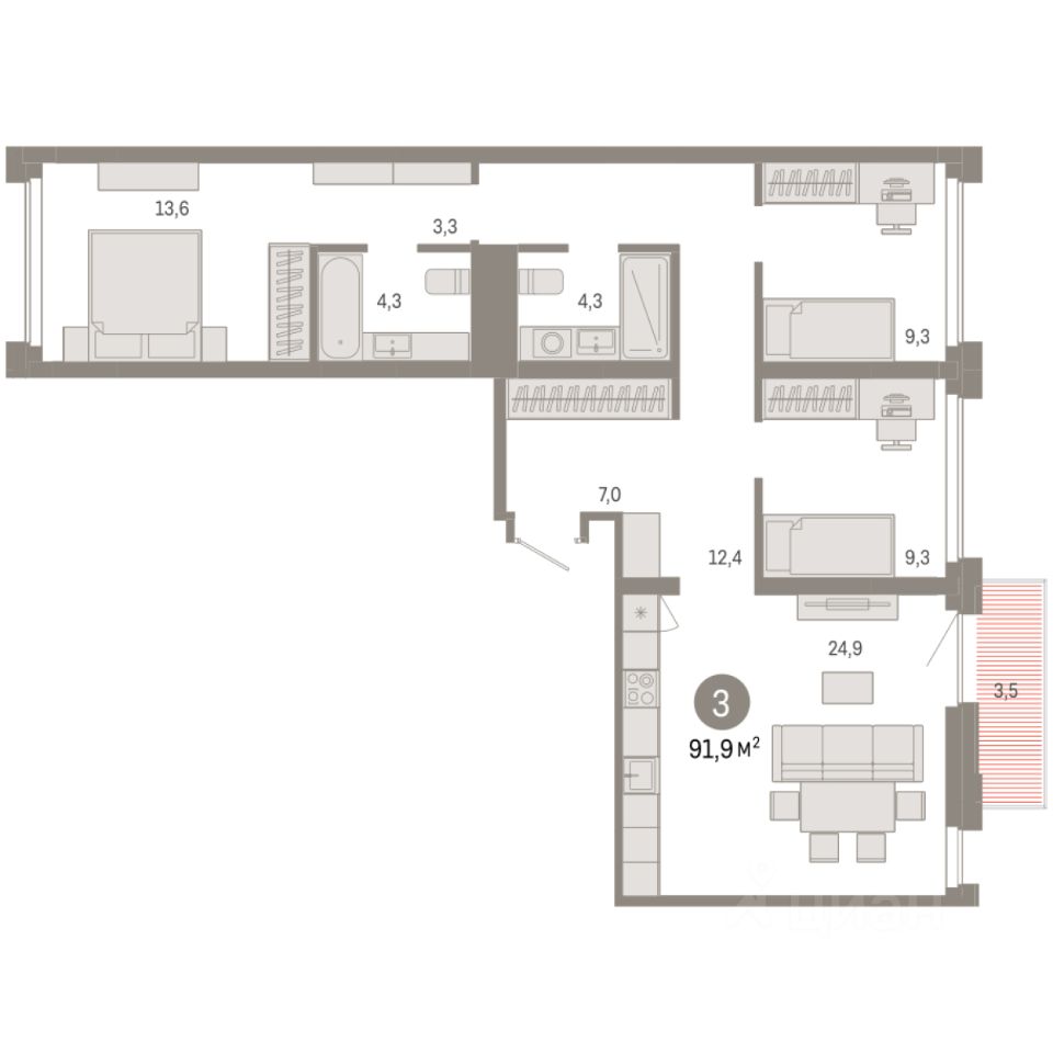 Квартира с кухней-гостиной и тремя спальнями в квартале "Нефть". Особенности планировки: окна на две стороны, гардеробная, окна в пол, вид во двор, разнесённые спальни, предчистовая отделка, мастер-спальня, балкон.