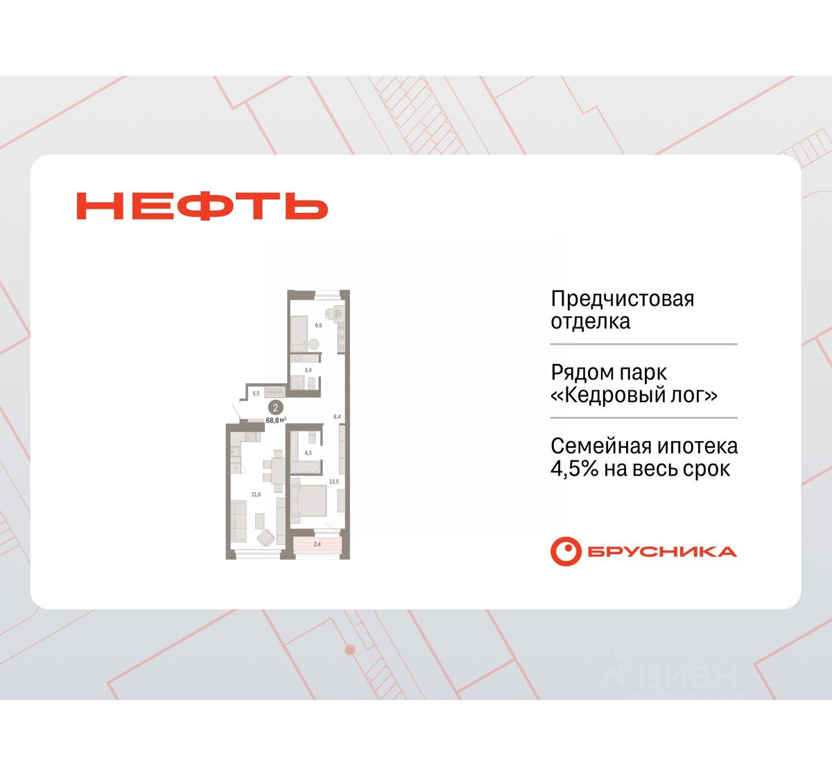 2-комн. квартира с предчистовой отделкой в ЖК "Нефть" на 6 этаже. Общая площадь: 68.82 кв.м., жилая: 23.1 кв.м., площадь просторной кухни-гостиной: 21.9 кв.м. Квартира - распашонка, без проходных комнат, окна выходят на paзные стороны дома. В квартире одна лоджия, два совмещенных санузла. Высота потолков 2.7 м.