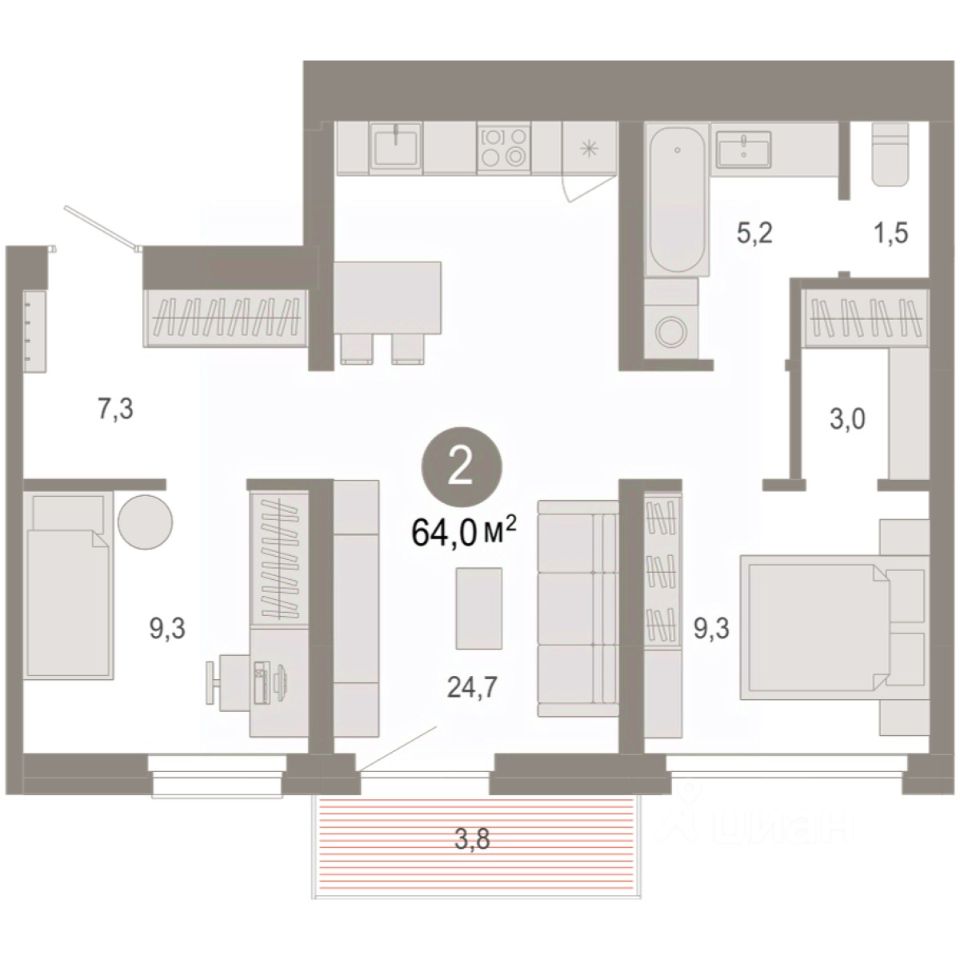 Квартира с кухней-гостиной и двумя спальнями в квартале "Нефть". Особенности планировки: гардеробная, вид во двор, разнесённые спальни, предчистовая отделка, балкон.