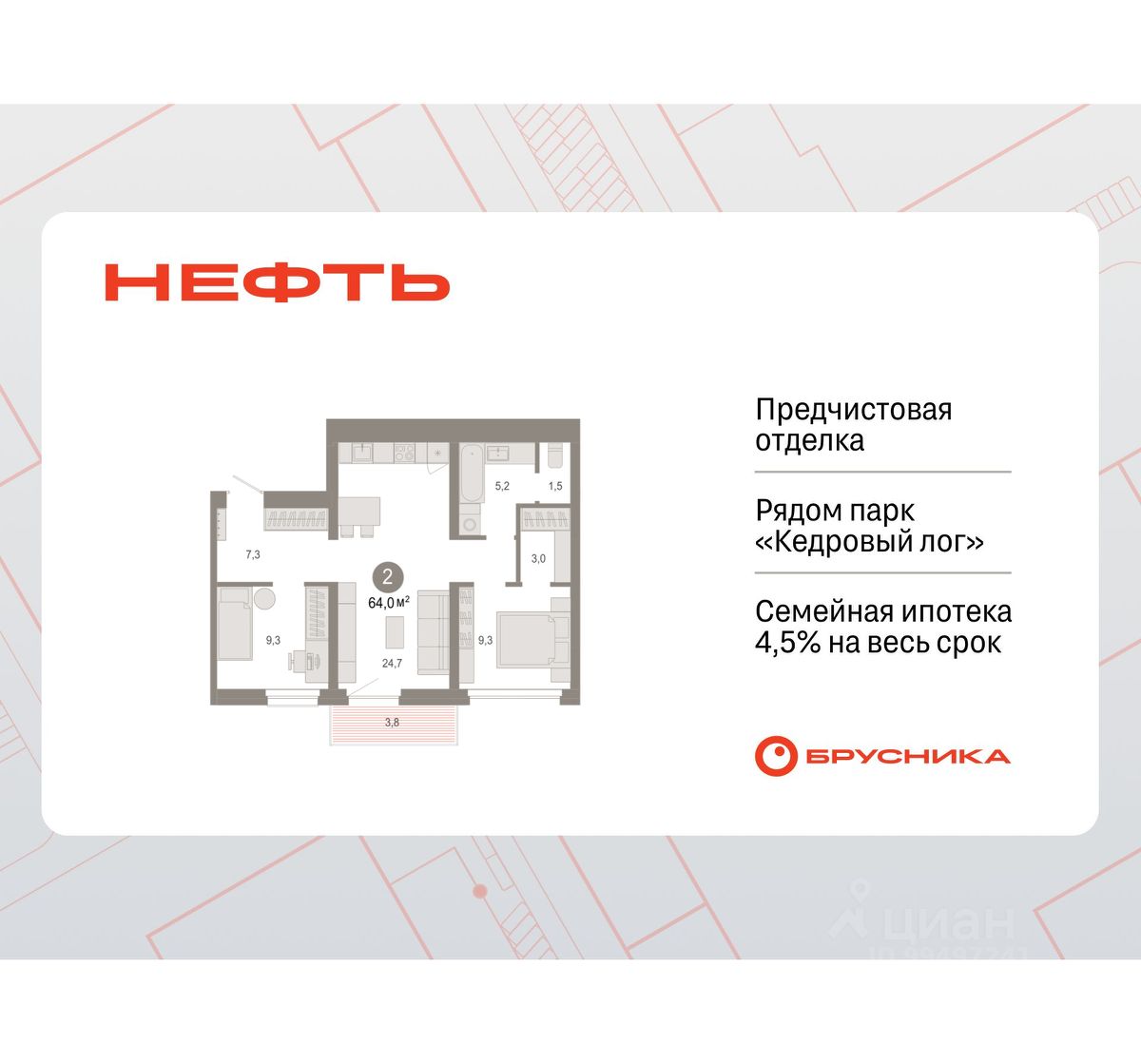 Продается двухкомнатная квартира от застройщика с предчистовой отделкой в ЖК "Нефть" на 7 этаже. Общая площадь: 64.04 кв.м., жилая: 18.6 кв.м., площадь просторной кухни-гостиной: 24.7 кв.м. Комнаты изолированные, все окна выходят на одну сторону. В квартире один балкон, один совмещенный санузел. Высота потолков 2.7 м.