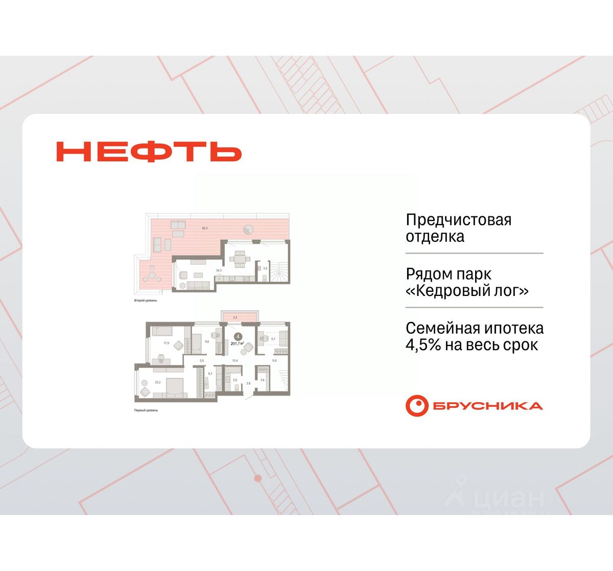4-комн. квартира от застройщика с предчистовой отделкой в ЖК "Нефть" на 7 этаже. Многоуровневая квартира, большая площадь и простор для воплощения дизайнерских идей. Общая площадь: 201.67 кв.м., жилая: 64.3 кв.м., площадь просторной кухни-гостиной: 34.3 кв.м. Угловая квартира, идеально подойдет любителям тишины и панорамных видов. В квартире два балкона, два совмещенных и один раздельный санузел. Наличие террасы в квартире дает возможность для обустройства дополнительной площади. Высота потолков 2.7 м.