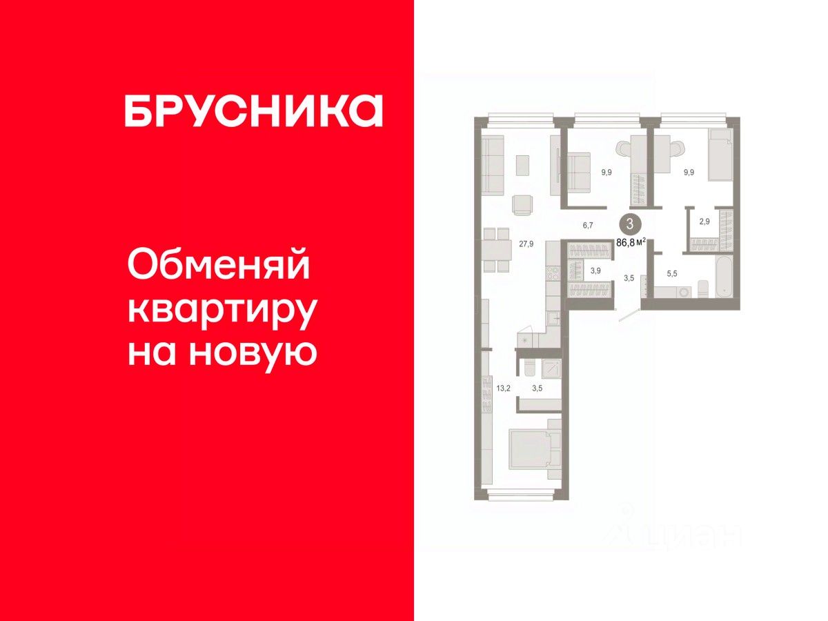 Квартира с кухней-гостиной и тремя спальнями в квартале "Нефть". Особенности планировки: вид во двор, гардеробная, мастер-спальня, окна на две стороны, предчистовая отделка, разнесённые спальни.