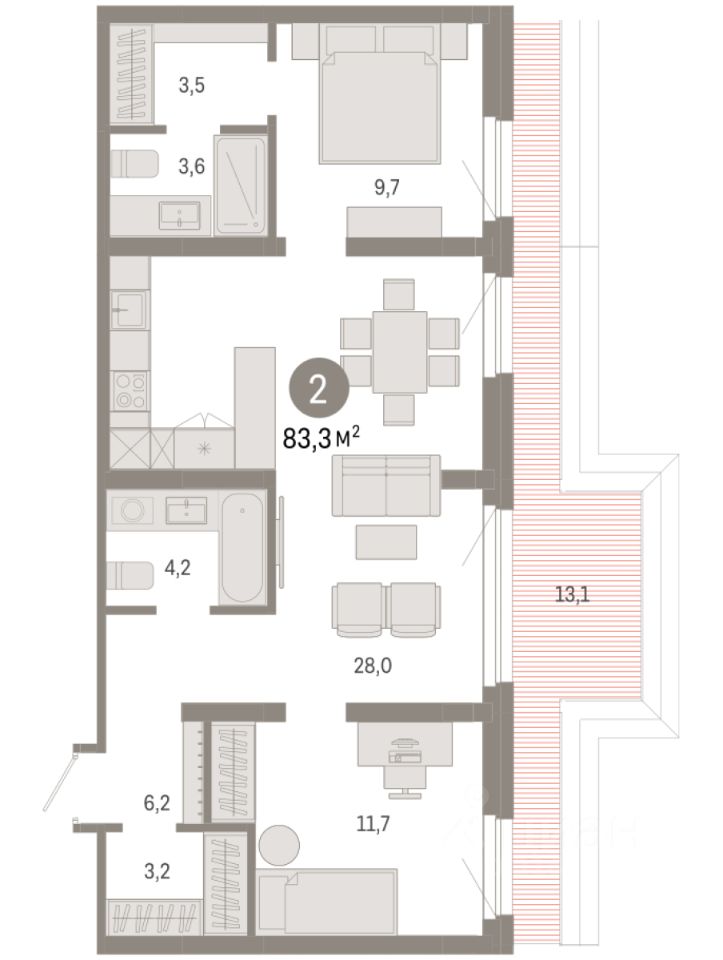 Квартира с кухней-гостиной и двумя спальнями в квартале "Нефть". Особенности планировки: гардеробная, разнесённые спальни, предчистовая отделка, мастер-спальня, терраса на крыше.