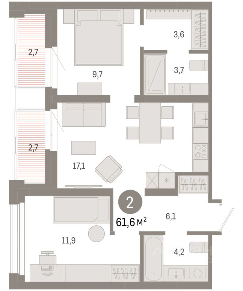 Просторная двухкомнатная квартира с предчистовой отделкой в ЖК "Нефть" на 5 этаже. Общая площадь: 61.62 кв.м., жилая: 21.6 кв.м., площадь просторной кухни-гостиной: 17.1 кв.м. Комнаты изолированные, все окна выходят на одну сторону. В квартире две лоджии, два совмещенных санузла. Высота потолков 2.7 м.
