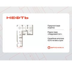 Квартира с кухней-гостиной и двумя спальнями в квартале "Нефть". Особенности планировки: балкон, вид во двор, второй санузел, гардеробная, мастер-спальня, постирочная, предчистовая отделка, разнесённые спальни.