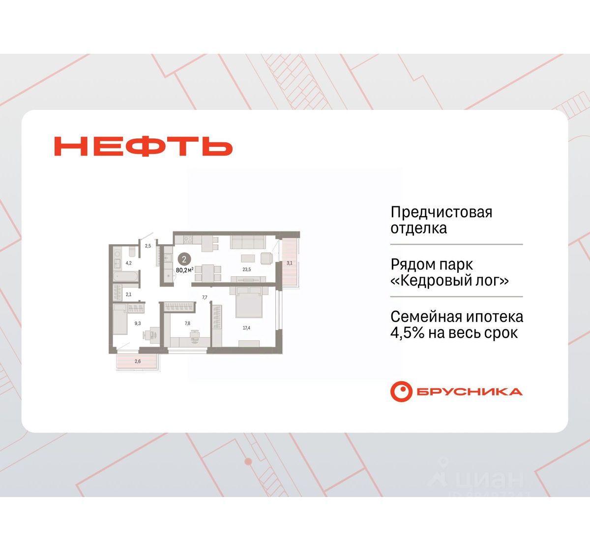 Двухкомнатная квартира с предчистовой отделкой в ЖК "Нефть" на 4 этаже. Общая площадь: 80.16 кв.м., жилая: 26.7 кв.м., площадь просторной кухни-гостиной: 23.5 кв.м. Угловая квартира, очень светлая, естественная вентиляция при открытии окон. В квартире два балкона, один совмещенный санузел. Высота потолков 2.7 м.