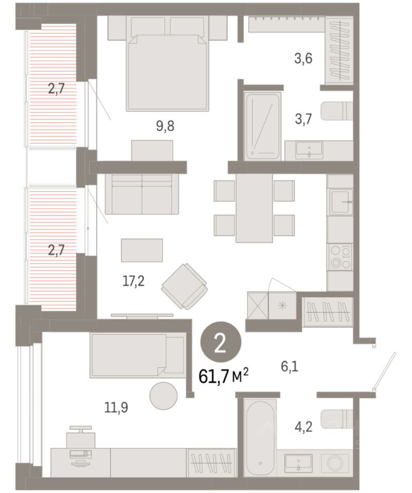 Двухкомнатная квартира от застройщика с предчистовой отделкой в ЖК "Нефть" на 7 этаже. Общая площадь: 61.68 кв.м., жилая: 21.7 кв.м., площадь просторной кухни-гостиной: 17.2 кв.м. Комнаты изолированные, все окна выходят на одну сторону. В квартире две лоджии, два совмещенных санузла. Высота потолков 2.7 м.