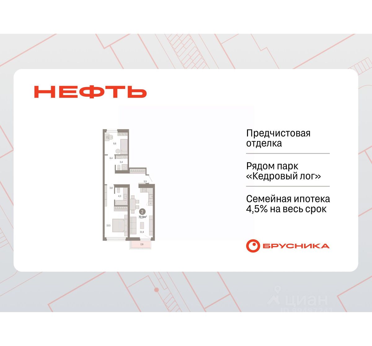 2-комн. квартира с предчистовой отделкой в ЖК "Нефть" на 8 этаже. Общая площадь: 72.88 кв.м., жилая: 23.1 кв.м., площадь просторной кухни-гостиной: 21.9 кв.м. Квартира - распашонка, без проходных комнат, окна выходят на paзные стороны дома. В квартире один балкон, два совмещенных санузла. Высота потолков 2.7 м.