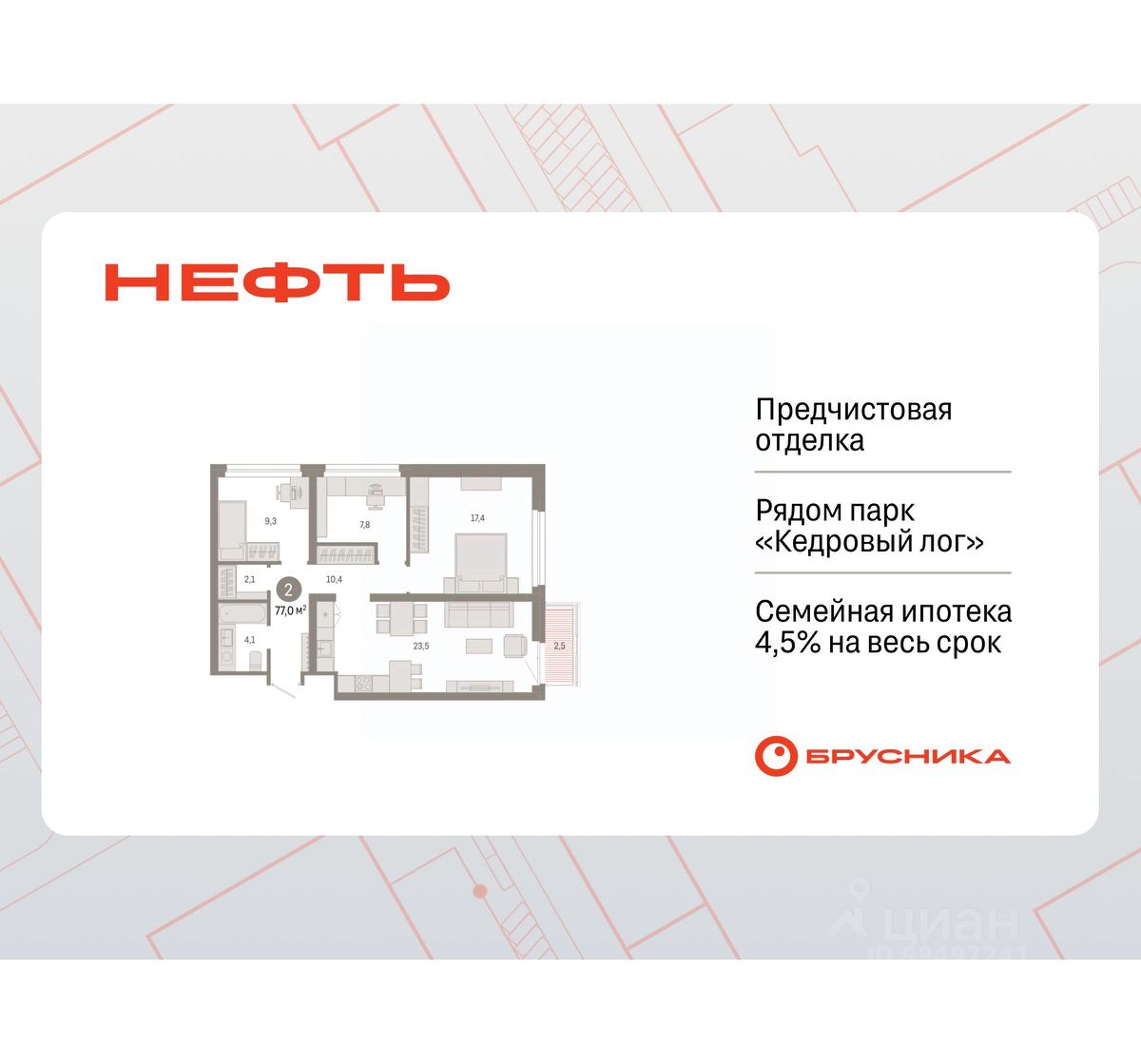 Квартира с кухней-гостиной и двумя спальнями в квартале "Нефть". Особенности планировки: гардеробная, рабочий кабинет, лоджия, разнесённые спальни, предчистовая отделка.