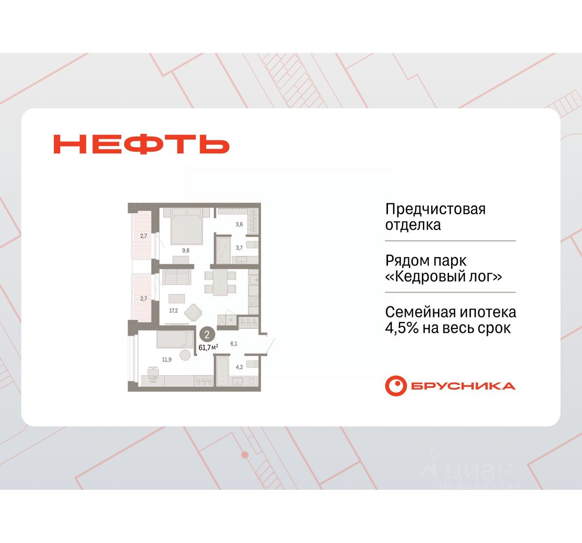 2-комн. квартира с предчистовой отделкой в ЖК "Нефть" на 8 этаже. Общая площадь: 61.68 кв.м., жилая: 21.7 кв.м., площадь просторной кухни-гостиной: 17.2 кв.м. Комнаты изолированные, все окна выходят на одну сторону. В квартире две лоджии, два совмещенных санузла. Высота потолков 2.7 м.