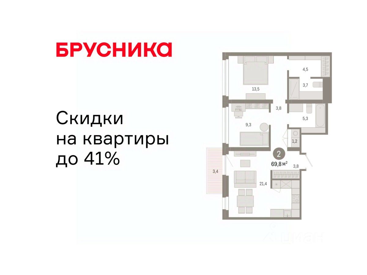 Квартира с кухней-гостиной и двумя спальнями в квартале "Нефть". Особенности планировки: мастер-спальня, предчистовая отделка.