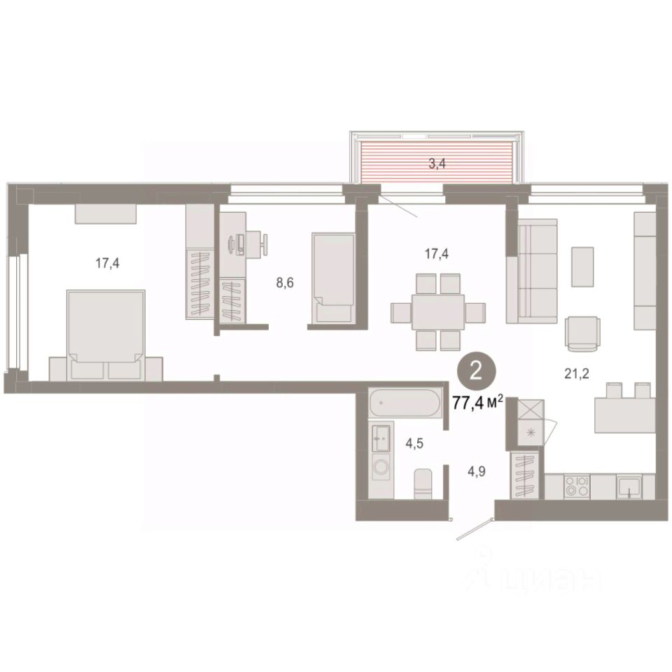 2-комн. квартира с предчистовой отделкой в ЖК "Нефть" на 4 этаже. Общая площадь: 77.39 кв.м., жилая: 34.8 кв.м., площадь просторной кухни-гостиной: 21.2 кв.м. Угловая квартира, окна oбecпeчивaют paвнoмepнoe ocвeщeниe в тeчeниe дня. В квартире один балкон, один совмещенный санузел. Высота потолков 2.7 м.