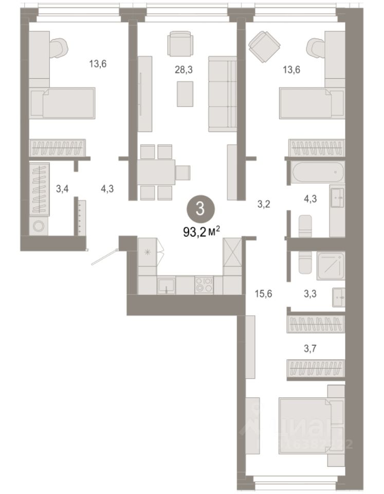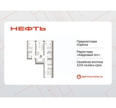 Квартира с кухней-гостиной и тремя спальнями в квартале "Нефть". Особенности планировки: окна на две стороны, гардеробная, вид во двор, разнесённые спальни, предчистовая отделка, мастер-спальня, постирочная.