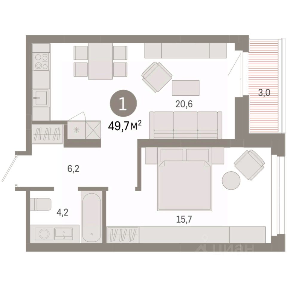 Однокомнатная квартира с предчистовой отделкой в ЖК "Нефть" на 8 этаже. Общая площадь: 49.72 кв.м., жилая: 15.7 кв.м., площадь просторной кухни-гостиной: 20.6 кв.м. Все окна выходят на одну сторону. В квартире одна лоджия, один совмещенный санузел. Высота потолков 2.7 м.