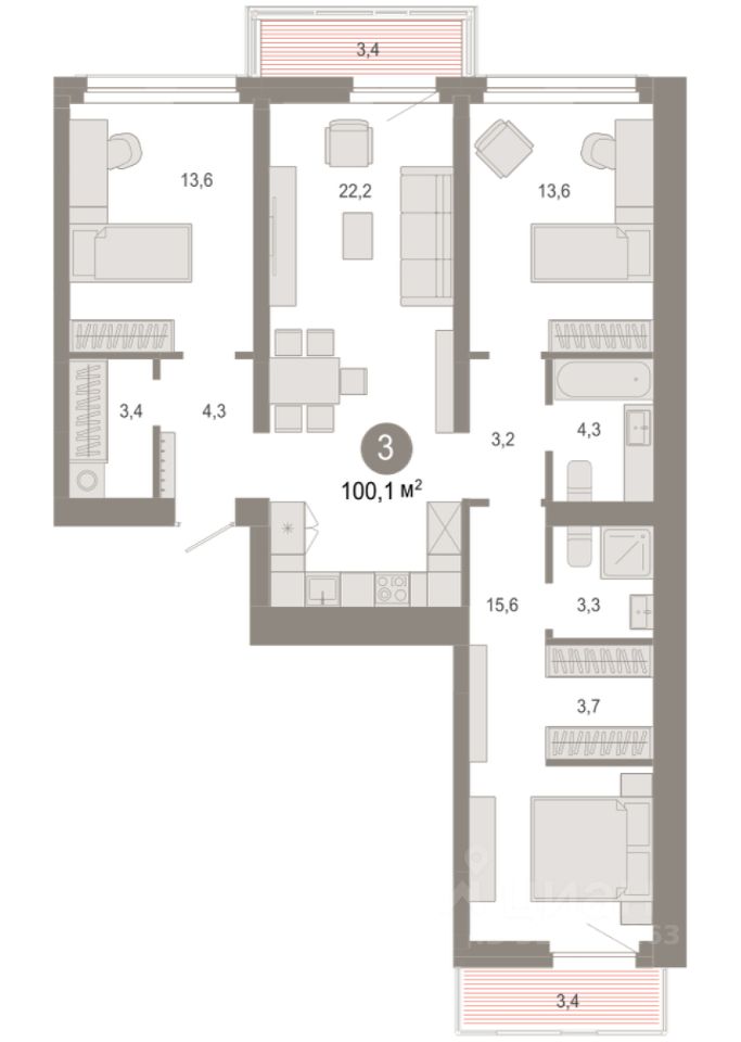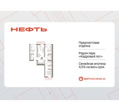 Квартира с кухней-гостиной и тремя спальнями в квартале "Нефть". Особенности планировки: балкон, вид во двор, гардеробная, мастер-спальня, окна на две стороны, постирочная, предчистовая отделка, разнесённые спальни.