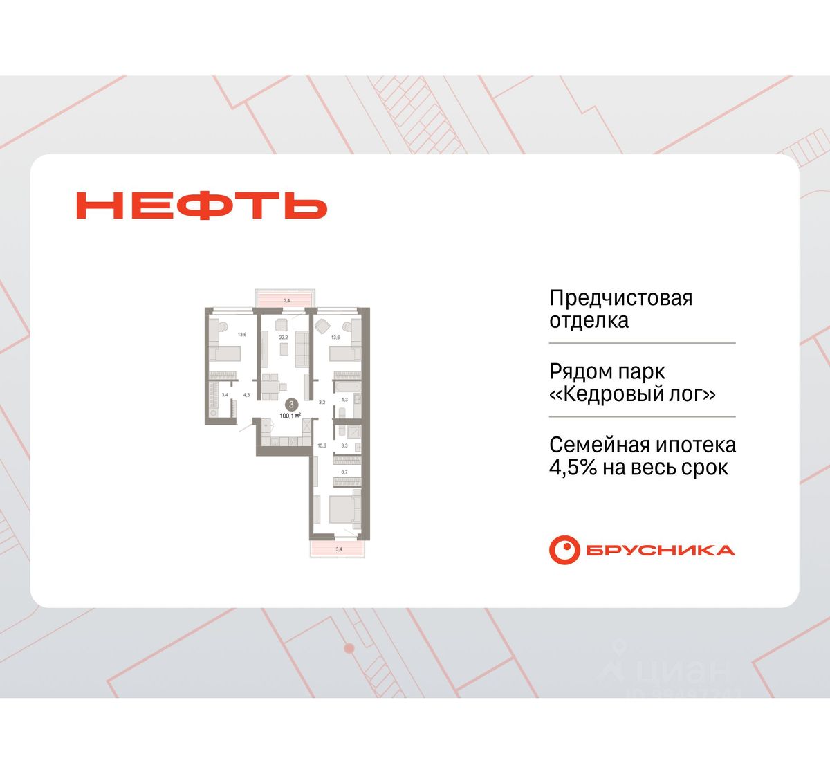 Продается 3-комн. квартира с предчистовой отделкой в ЖК "Нефть" на 4 этаже. Общая площадь: 100.13 кв.м., жилая: 42.8 кв.м., площадь просторной кухни-гостиной: 22.2 кв.м. Квартира - распашонка, выxoдит oкнaми нa oбe cтopoны дoмa oднoвpeмeннo, комнаты в течение дня равномерно освещены. В квартире два балкона, два совмещенных санузла. Высота потолков 2.7 м.