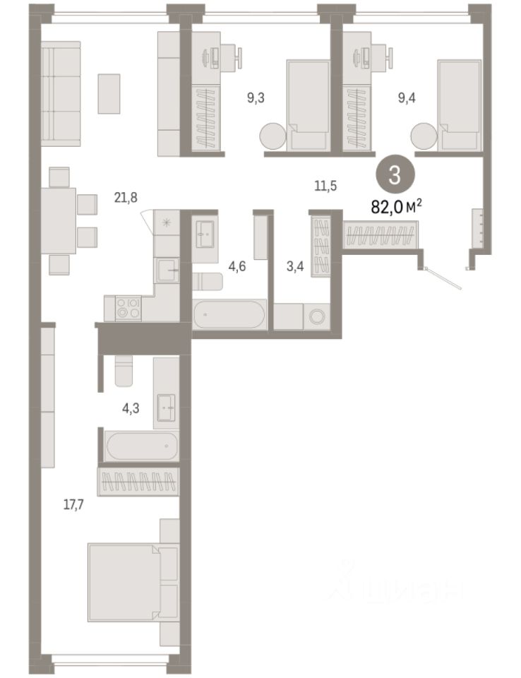 Квартира с кухней-гостиной и тремя спальнями в квартале "Нефть". Особенности планировки: окна на две стороны, гардеробная, вид во двор, разнесённые спальни, предчистовая отделка, мастер-спальня, постирочная.