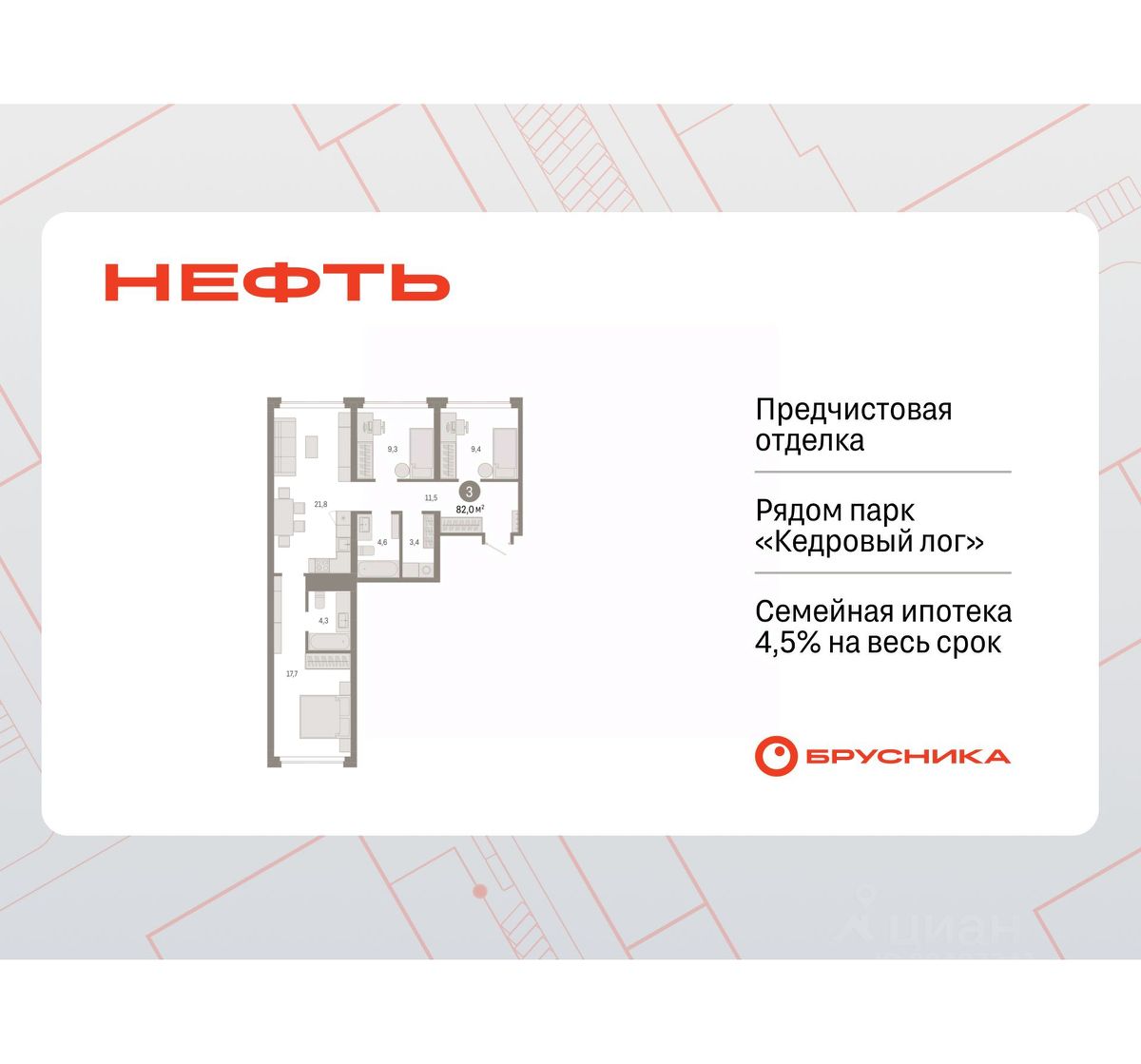 Продается 3-комн. квартира с предчистовой отделкой в ЖК "Нефть" на 2 этаже. Общая площадь: 82.01 кв.м., жилая: 36.4 кв.м., площадь просторной кухни-гостиной: 21.8 кв.м. Квартира - распашонка, без проходных комнат, окна выходят на paзные стороны дома. В квартире два совмещенных санузла. Высота потолков 2.7 м.