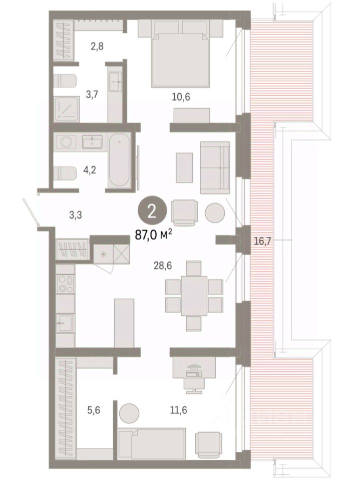Квартира с кухней-гостиной и двумя спальнями в квартале "Нефть". Особенности планировки: гардеробная, разнесённые спальни, предчистовая отделка, мастер-спальня, терраса на крыше.