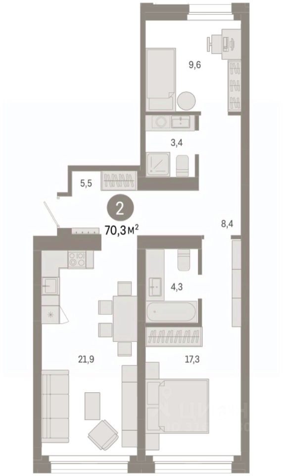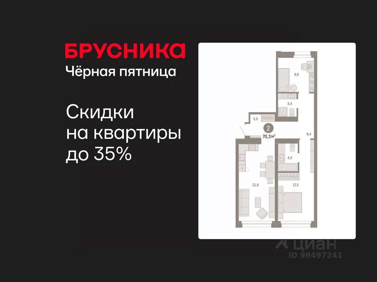 Квартира с кухней-гостиной и двумя спальнями в квартале "Нефть". Особенности планировки: окна на две стороны, гардеробная, вид во двор, разнесённые спальни, предчистовая отделка, мастер-спальня.