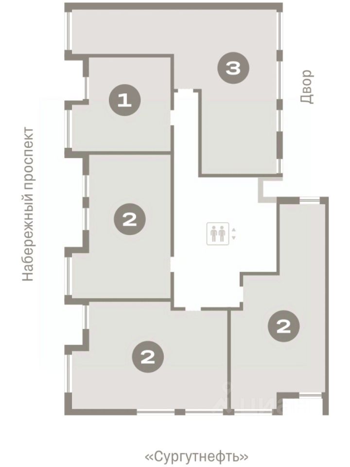 Квартира с кухней-гостиной и тремя спальнями в квартале "Нефть". Особенности планировки: окна на две стороны, гардеробная, вид во двор, разнесённые спальни, предчистовая отделка, мастер-спальня, балкон.