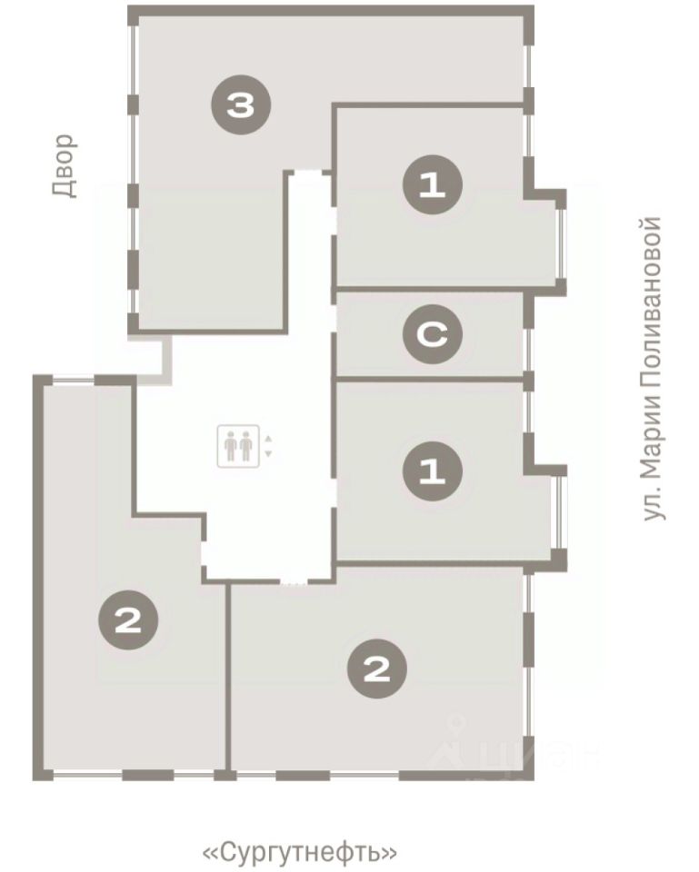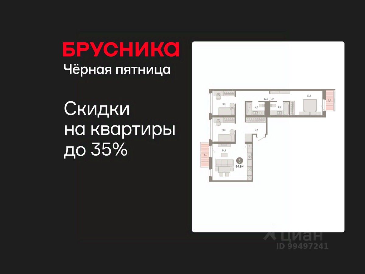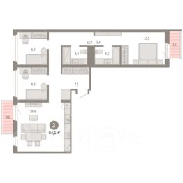 Квартира с кухней-гостиной и тремя спальнями в квартале "Нефть". Особенности планировки: окна на две стороны, гардеробная, вид во двор, лоджия, разнесённые спальни, предчистовая отделка, мастер-спальня, балкон.