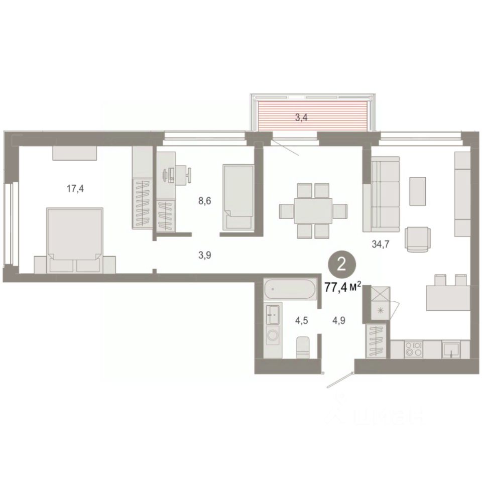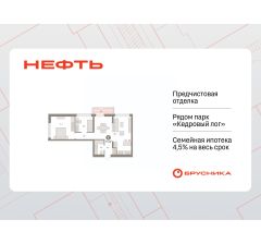 Квартира с кухней-гостиной и двумя спальнями в квартале "Нефть". Особенности планировки: балкон, предчистовая отделка, разнесённые спальни.