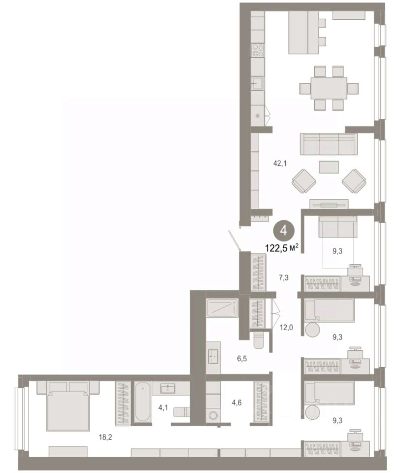 Квартира с кухней-гостиной и четырьмя спальнями в квартале "Нефть". Особенности планировки: окна на две стороны, гардеробная, рабочий кабинет, вид во двор, разнесённые спальни, предчистовая отделка, мастер-спальня, постирочная.